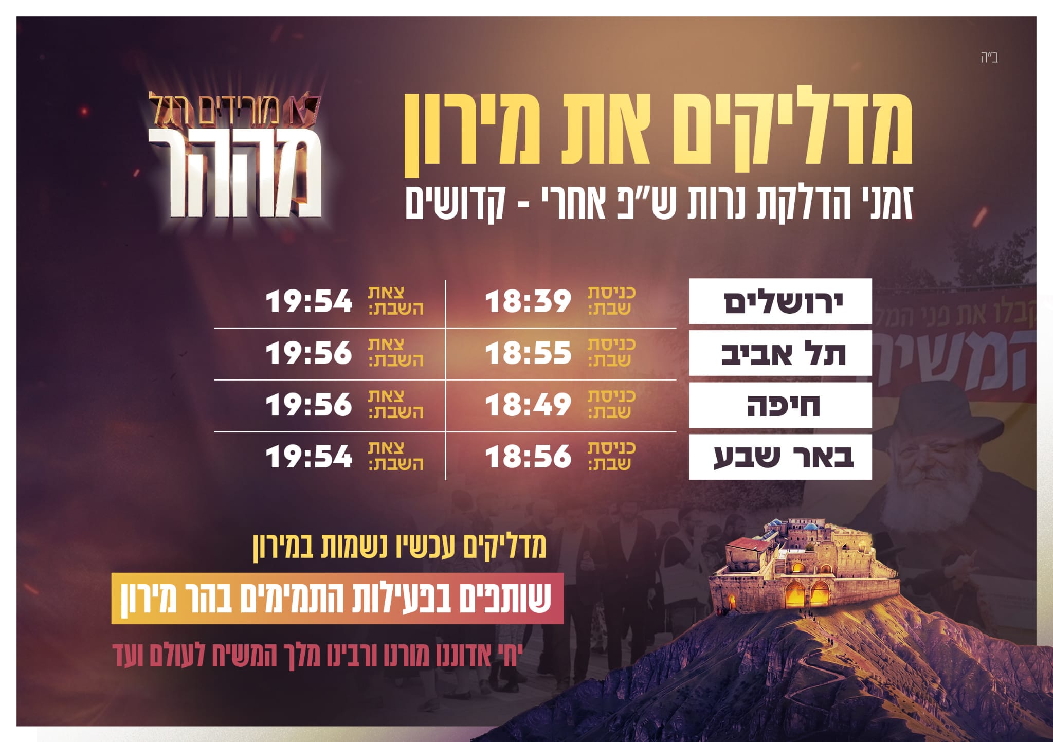 מדליקים את מירון: זמני הדלקת נרות שבת ש"פ אחרי-קדושים • בערב שבת, בואו להדליק נשמות במירון – שותפים עכשיו בפעילות התמימים בהר מירון, לכבודו של רשב"י ולקבלת פני משיח צדקנו בפועל ממש • לתרומה – לחץ כאן