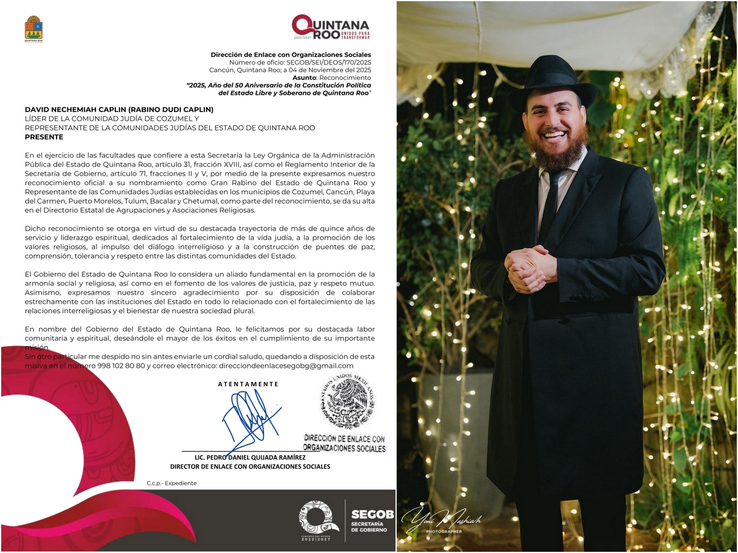 בשעה טובה ובעיצומם של ההכנות לקראת כינוס השלוחים העולמי, ממשלת מדינת קינטנה רו, הכירה באופן רשמי בשליח הרבי לקוזומל במקסיקו – הרב דודי כפלין, כרב הראשי של המדינה. "אנו מביעים בזה את ההכרה הרשמית במינויו של כבוד הרב דודי קפלין לרב הראשי של מדינת קינטנה רו, וכן כנציג הקהילות היהודיות" • למכתב המלא