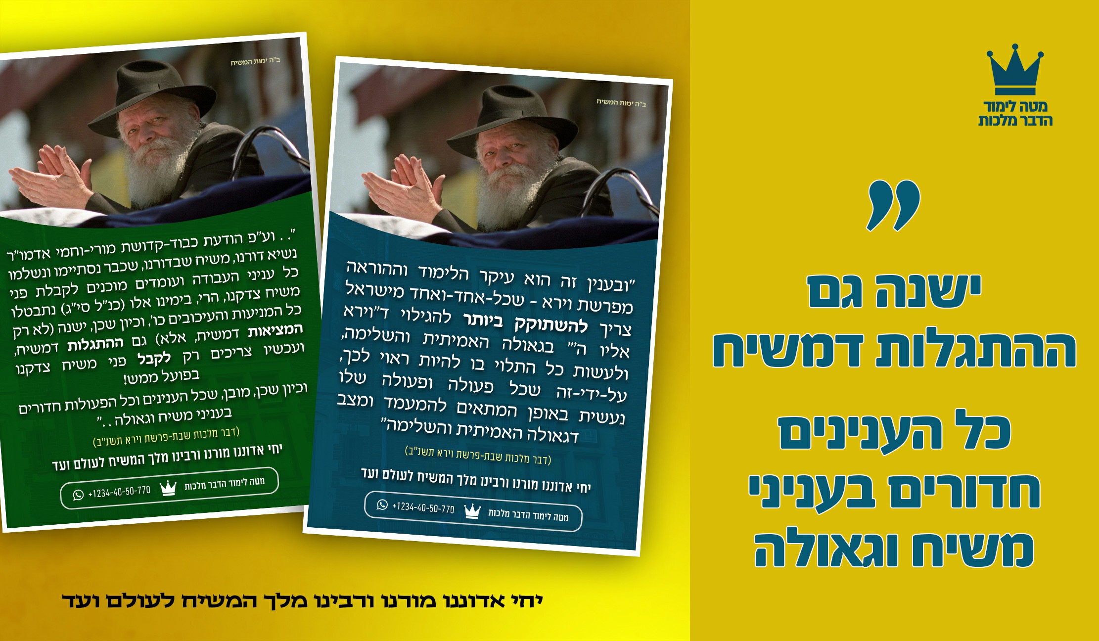 העיניים שלך מסוגלות לקלוט: התגלות משיח כבר נמצאת! • השיעור העולמי המיוחד בדבר מלכות השבועי, השבוע עם הרב מנחם מענדל וילשאנסקי, רב הקהילה הצעירה נוו"ג וראש ישיבת חב"ד חיפה • הערב, יום חמישי בשעה 21:15 שעון ישראל • לכניסה לשיעור