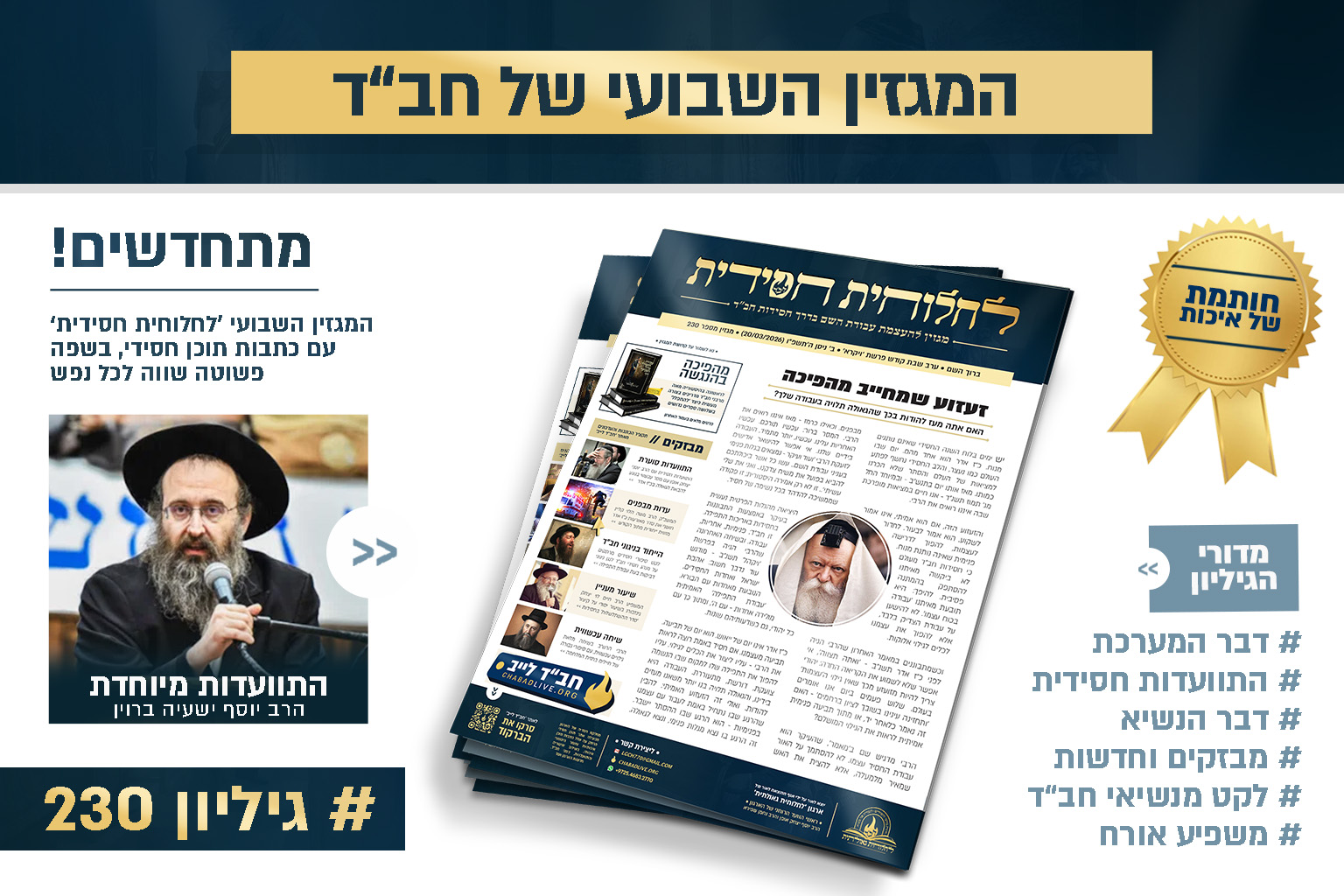 פותחים את ההכנות לי"א ניסן באנרגיה חסידית בוערת: המגזין החדש 'לחלוחית חסידית' מספר 230, במתכונת מיוחדת עם חוויית קריאה שנוגעת במקום שבו חסידות פוגשת את הלב • בגיליון מחכה לכם מסע מרתק: המדורים הקבועים, אורח מיוחד – הרב נחמן שפירא, ובשיא: התוועדות חסידית סוחפת עם הרב יוסף ישעיה ברוין, רב שכונת קראון הייטס בניו יורק • להורדה