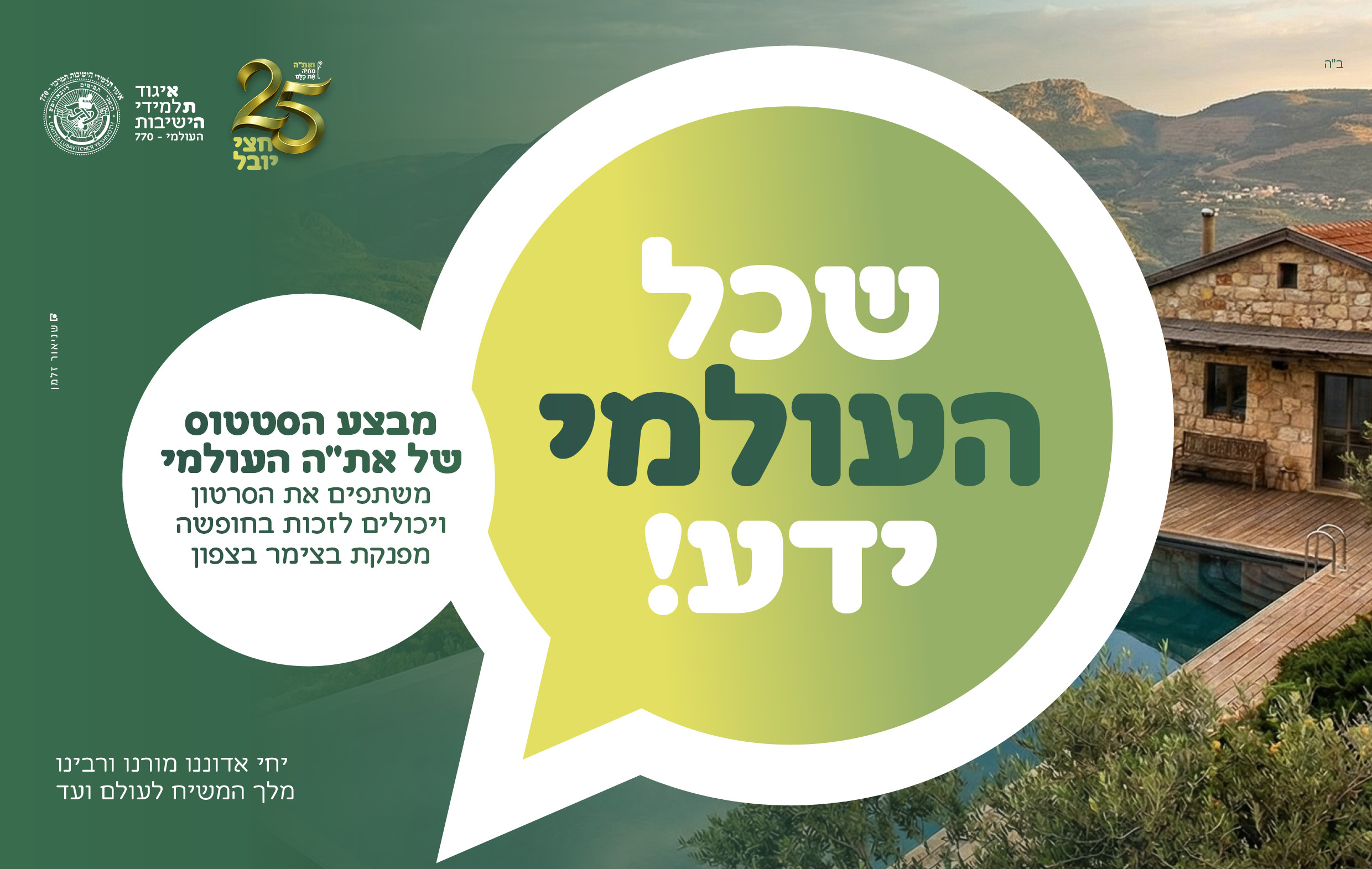 כל חסיד רוצה להתעלות מעל השגרה היומיות, להתנתק מהדאגות והבלבולים וללבוש את המשקפיים הנכונים שיעזרו לו לראות גאולה | עם הפעילות של את"ה העולמי, זו המציאות אותה חווים ומרגישים אלפי תמימים בישיבות תות"ל סביב מעגל השנה • ככה התמימים חיים היום גאולה • היו שותפים עם את"ה! • צפו