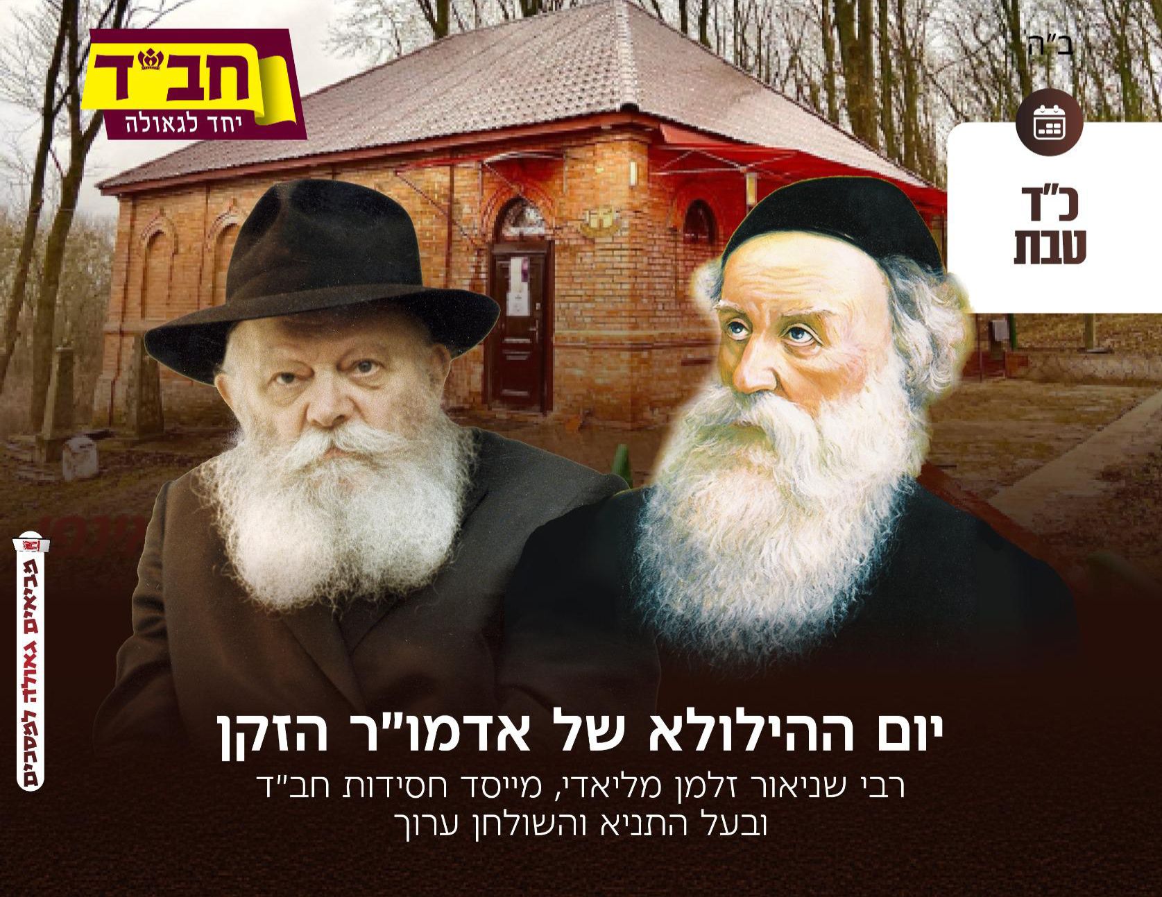 בכ"ד טבת מציינים חסידי חב"ד את יום הסתלקותו של כ"ק האדמו"ר הזקן בעל התניא והשולחן ערוך, מייסדה של שיטת חסידות חב"ד והאדמו"ר הראשון בשושלת אדמו"רי חב"ד. אדה"ז נולד ביום י"ח באלול תק"ה, הסתלק ביום כ"ד בטבת ה'תקע"ג ומנוחתו כבוד בעיירה האדיטש • הסתלק במוצ"ש פרשת שמות מיד לאחר ערבית והבדלה • לערך המלא בחב"דפדיה