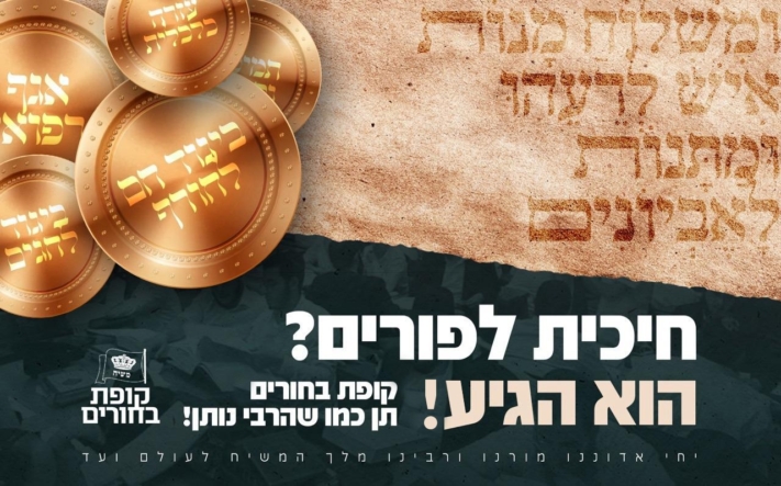 בשיאו של יום הפורים, הרבי מלך המשיח דואג אישית לבנים שלו – "דעם רבי'נס קינדער", ונותן מתנות לאביונים עבור 'קופת בחורים – 770'. זו ההזדמנות שלכם להדר במצווה ולדאוג לתמימים לביגוד, צרכים בסיסיים, התוועדויות וסיוע רפואי. בואו נדאג לתמימים. עכשיו! • לתרומה מהירה ולקיום מצוות היום כמו שהרבי מקיים
