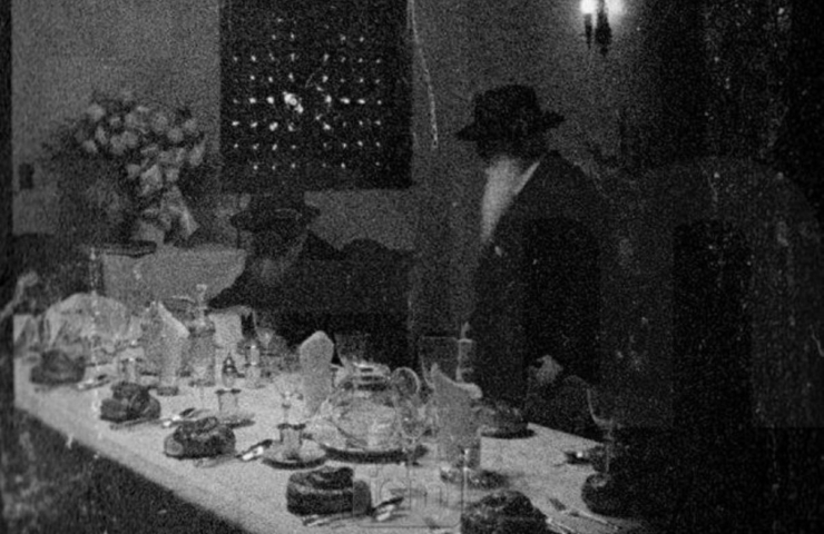 תמונה חדשה מהרבי בסעודת מוצאי יום הכיפורים (כנראה שנת תשכ"ח) בביתו של הרבי הריי"צ, המסובים הלכו ליטול ידיים לסעודה, הרבי נטל ידיים ראשון. בתמונה רואים את הרבי יושב, ואת הרב שלמה אהרן קזרנובסקי עומד • לתמונה המלאה
